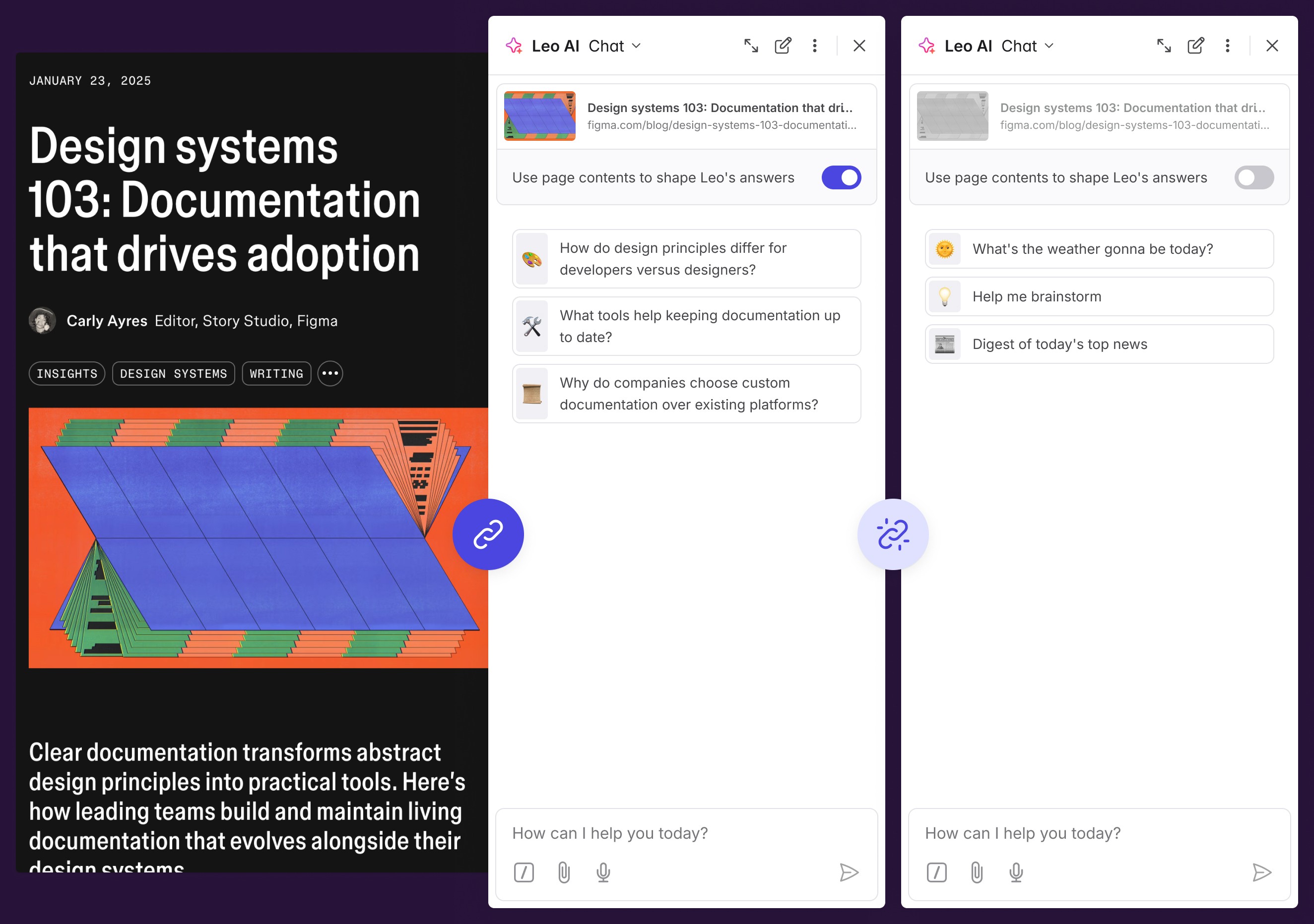 When opening Leo in the sidebar, we had to show an easy way to add the current tabs' content as the context for Leo's conversation, or be able to quickly shut it off for non-related questions.